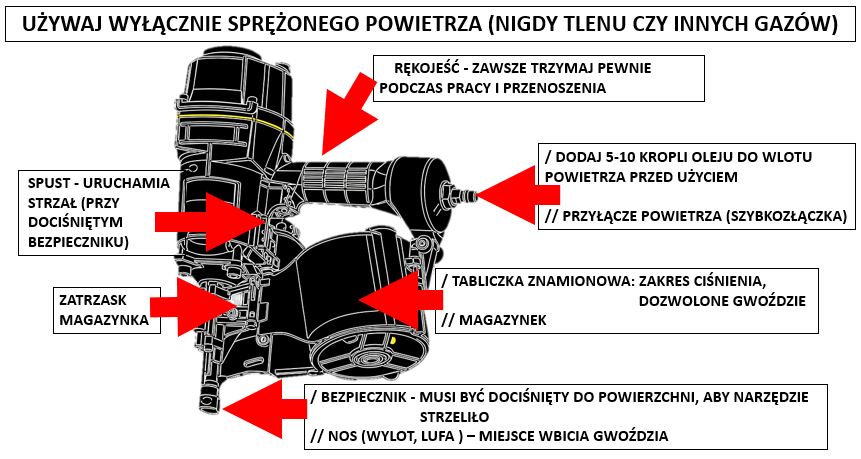 Uwaga: Jest to instrukcja minimum. Przed zapoznaniem się z nią należy bezwzględnie przeczytać i zrozumieć pełną instrukcję obsługi danej gwoździarki pneumatycznej.