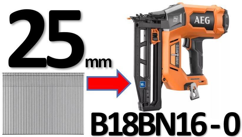 Model AEG B18BN16 obsługuje wyłącznie gwoździe 16G (1,6 mm) o długości od 25 do 65 mm. Oferowane gwoździe 25–65 mm mieszczą się w pełnym zakresie roboczym urządzenia i są zgodne z jego konstrukcją.